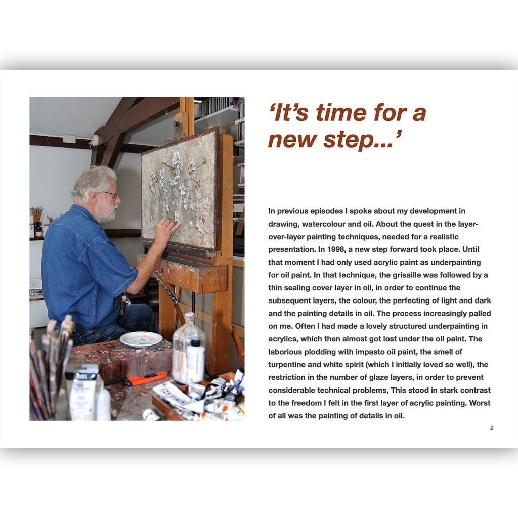 I’m glad in 1998 I decided to say goodbye to oil paint and to continue painting only in acrylics. In hindsight, that is actually quite logical. Acrylic paint is a water-soluble type of paint, which can be used with similar immediacy to drawing, and is related to watercolour or tempera, with which I was very experienced. Thanks to the water, the paint flows from a paint brush, which is not the case with oil paint, heavy bodied mass. And, last but not least, acrylic paint dries wonderfully fast, which makes it possible to continue working on the same painting without delay. With colleagues, supporters and opponents of the various types of paint, I have had many discussions.