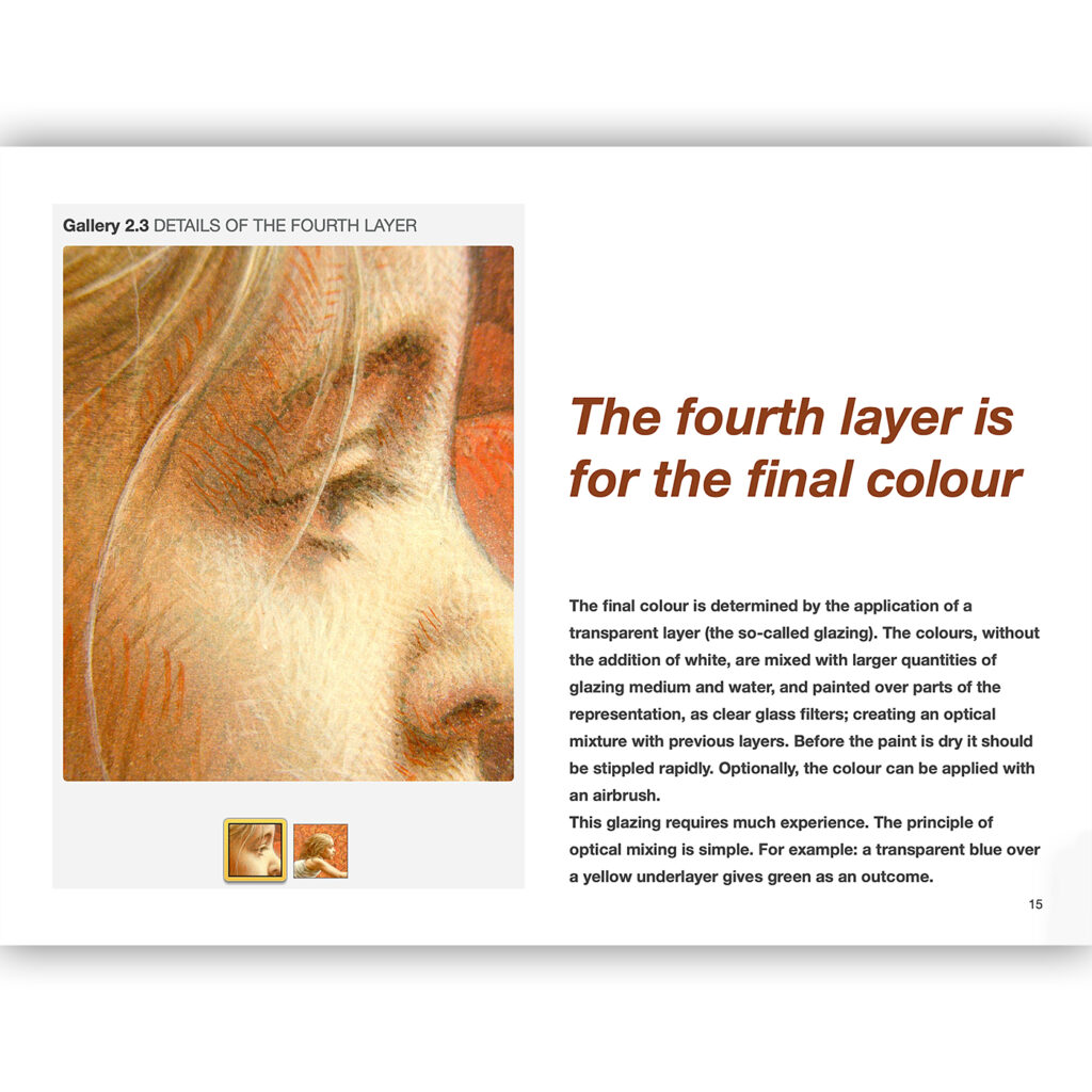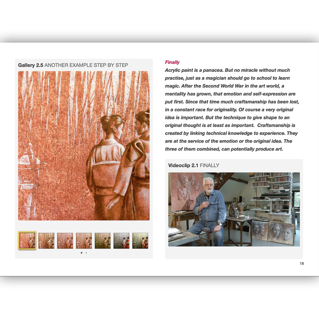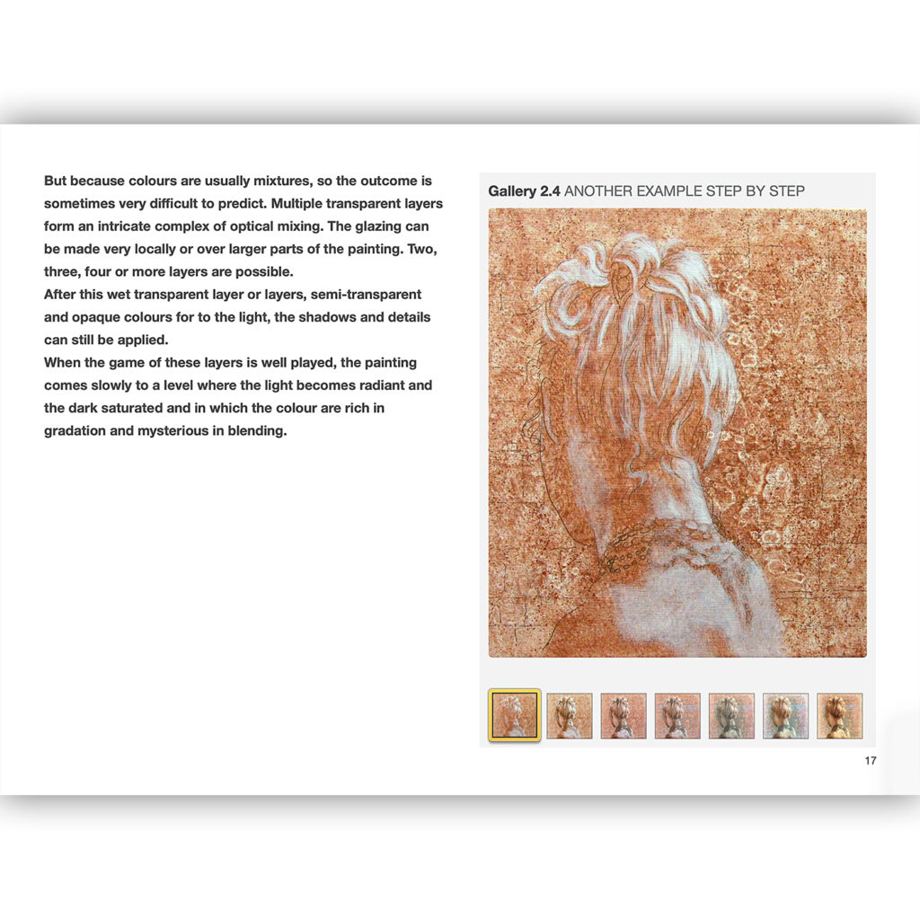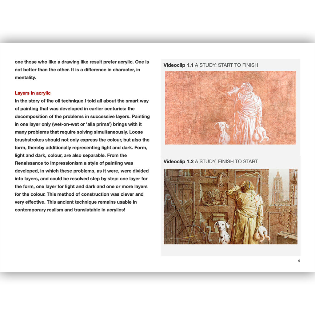 From the Renaissance to Impressionism a style of painting was developed, in which these problems, as it were, were divided into layers, and could be resolved step by step: one layer for the form, one layer for light and dark and one or more layers for the colour. This method of construction was clever and very effective. This ancient technique remains usable in contemporary realism and translatable in acrylics!