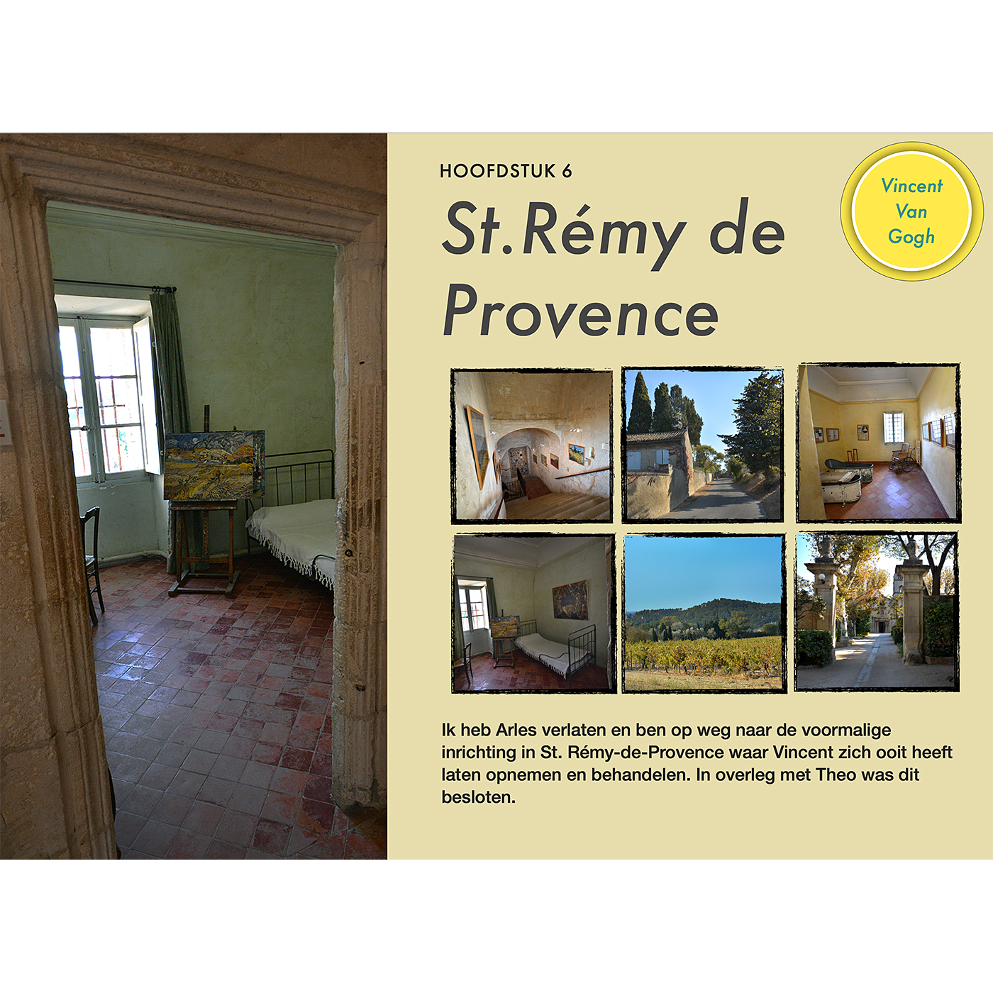 In deze serie digitale boeken over Vincent van Gogh ligt de nadruk op de fotografie en minder op de tekst. Ik beschrijf het leven van Vincent van Gogh in hoofdlijnen. Zoals zijn periode in en rond Arles. Voor mij is vooral belangrijk wat hij hier heeft gezien! Bijna alle plaatsen waar hij is geweest, heeft geschilderd, gewoond en geleden, heb ik in gedetailleerd in beeld gebracht. Gedurende twee jaar trok ik met mijn campertje door Europa. Deze digitale boekenserie is daarvan het resultaat.