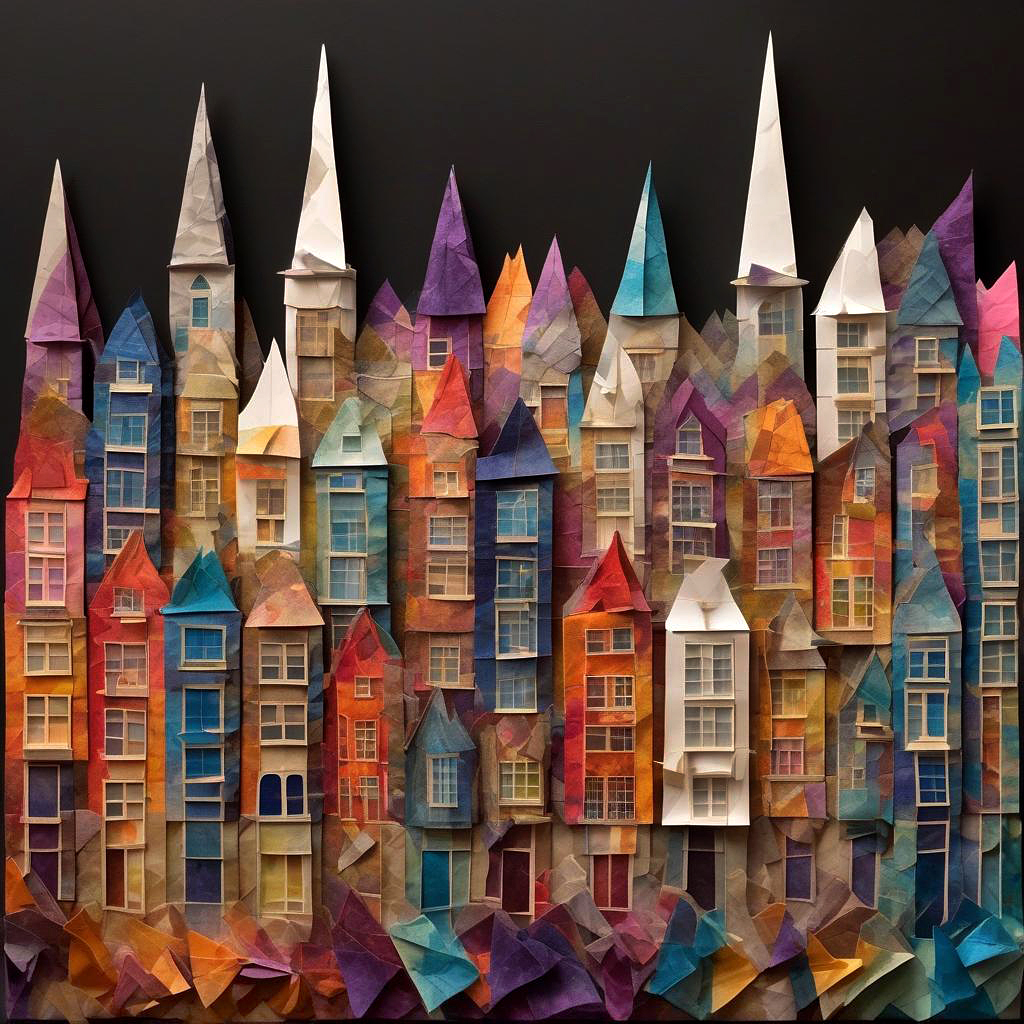 Boven: Venetië en Honfleurs(Frankrijk). Vrolijke en kleurrijke werkstukken die uw ruimte iets bijzonders geven. Maak kennis met mijn betoverende Skyline creaties van kleurrijk papier: speelse werkstukken die ik met zorg realiseerde.